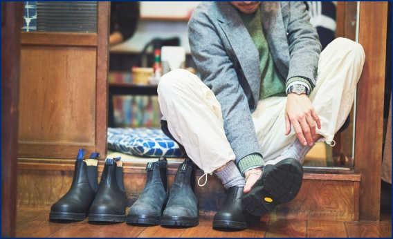 座敷に腰をかけてブーツのストラップに手をかけ足を引き抜くと、ブーツとは思えないくらいスルッと脱ぐことができる。街で不意に現れるこんなシーンにもスマートに対応できるところが嬉しいポイント。