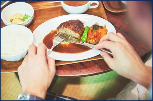 今回注文したのは、ちゃぶ台の看板メニューのハンバーグとカレーとパスタ。スープと卵焼きがセットになっている。