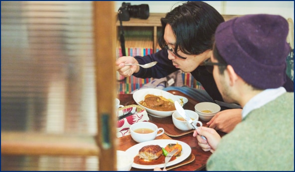 代官山からクルマを走らせること20分、ちょうどいい腹具合になってきたところで到着したのは世田谷区赤堤にある「ちゃぶ台」という洋食屋。名前の通り、雰囲気のある店内の一番奥にはポツンとちゃぶ台が置いてある座敷がある。今回僕らはその座敷を使わせて頂くことに。