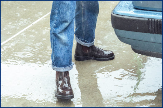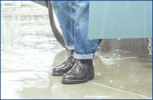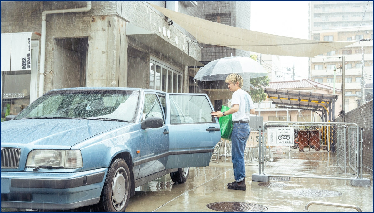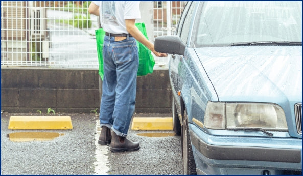 今回はこのボルボで雨の街へ向かうことに。曇り空や雨のイメージにピッタリなライトブルーのボディ・・・いいクルマといいブーツで、雨の日もごきげんに過ごしたい!