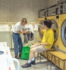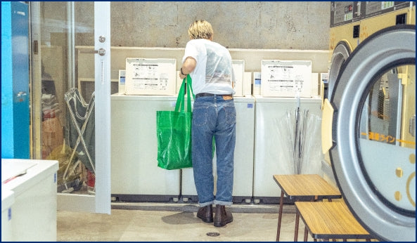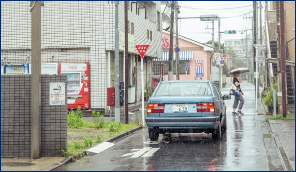 雨の中クルマを走らせるのは意外にも心地いい。雨音や濡れた路面をタイヤが転がる音を聞きながらドライブしているうちに狛江湯のモダンな看板が見えてきた。お店の前にクルマを停め、コインランドリーへ。洗剤や洗濯物が乾くいい匂いがする中、自分の洗濯物を洗濯機へ。