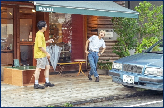 鷺沼駅前近くにある「喫茶SUNDAE」の店前には緑色のタープが出ていて、落ち着いた店構えが心地いい。お店の前のスペースにクルマを停めて、タープの下でマコトを待つことに。いくらクルマでの移動とはいえ、やっぱり濡れた地面を踏む瞬間は避けられないけれど、Blundstoneのブーツなら、安心して歩くことができる。