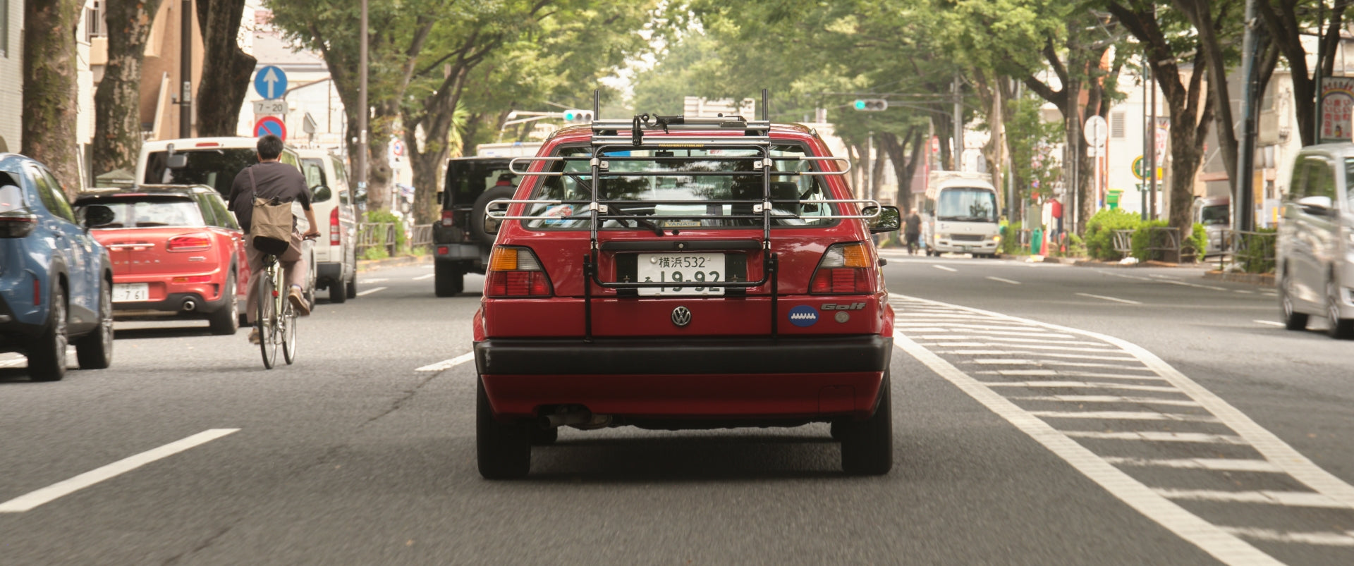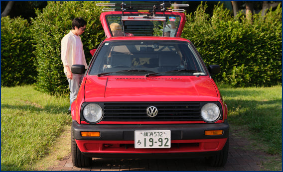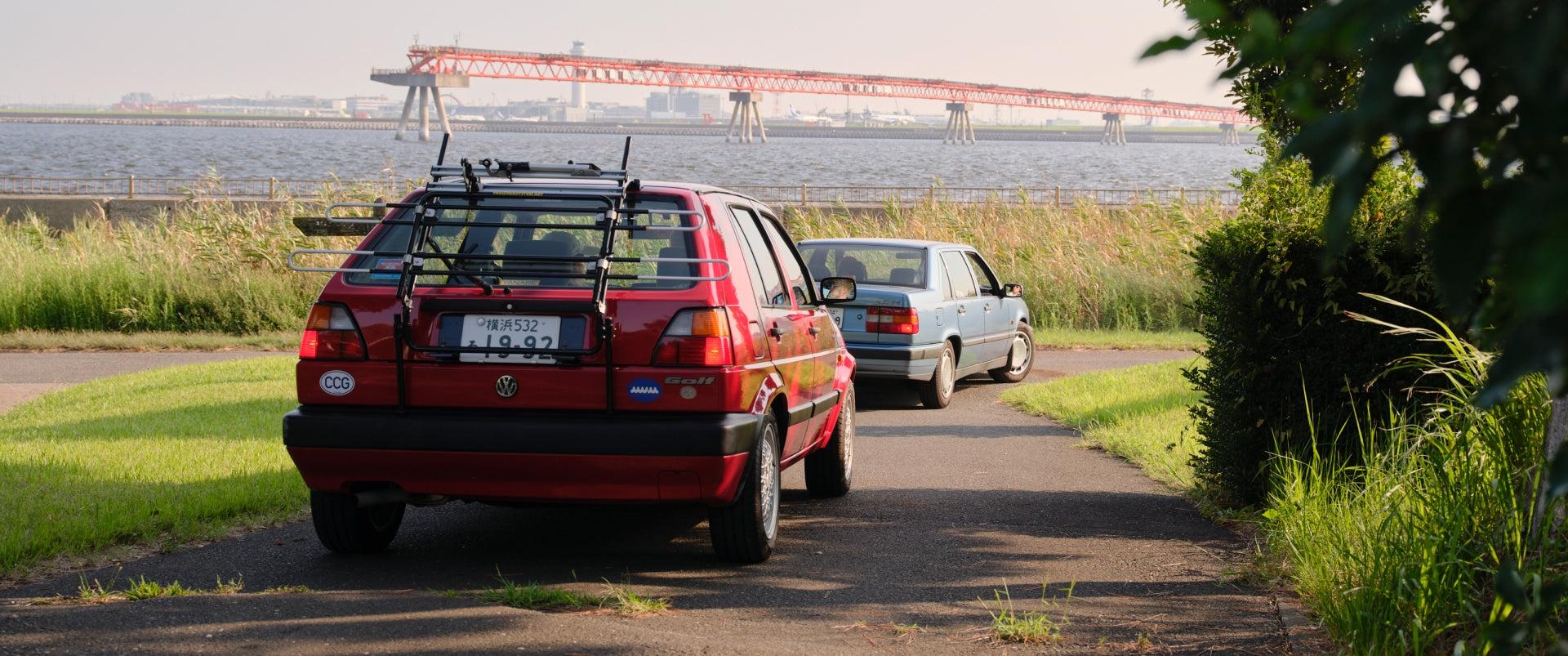 今回の旅の主役はワダさんご夫婦と赤色のゴルフ2。ネオクラシック車の中で王道のゴルフ2、王道であることには理由がある。街をいくのに絶妙なボディサイズに、愛嬌たっぷりの丸目の顔。ゆるくかわいい雰囲気と、ドイツ車らしいカッチリしたデザインのバランス感が魅力!