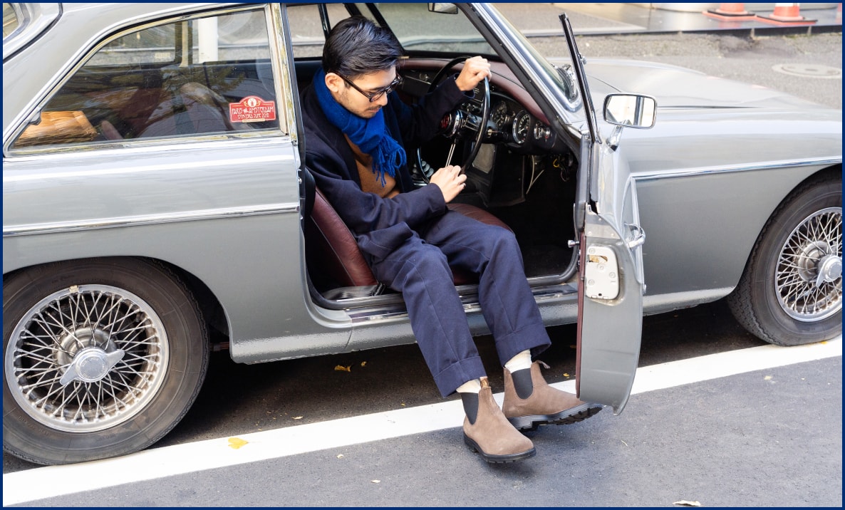 クルマとファッションを考える上で、クラシックなMGBに乗るときは一つ一つのアイテムはシンプルなものを選ぶことを意識しているというホタカさん。丸の内 × クラシックカーという、言葉だけ聞くと出来すぎたシーンをさらりと乗りこなすコツはそこにあるのかも。 Blundstoneのブーツは、シンプルで丸みのある形が程よくファッションに馴染む上に、街だけではなく足元が悪い場所にもそのまま行けてしまうところが心の余裕につながっていて気に入っているのだとか。