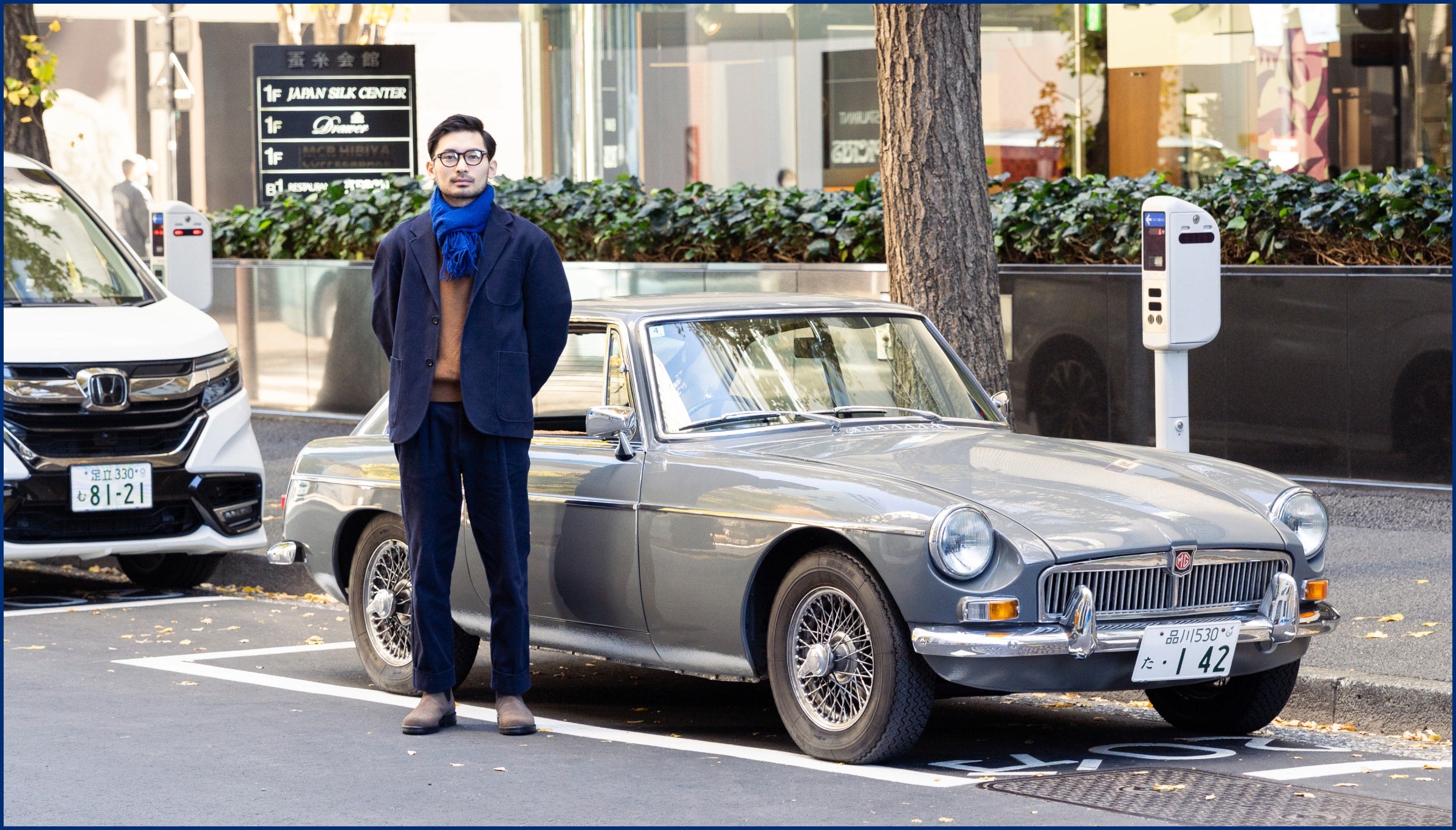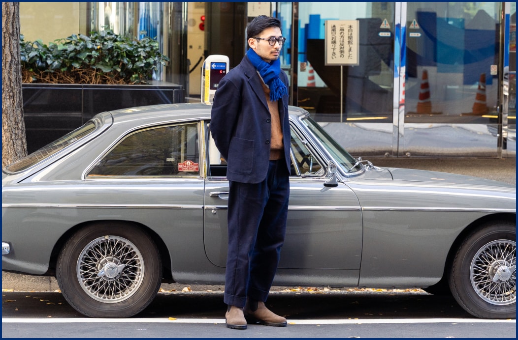 宝石のような小粒なイギリス製のヴィンテージカーを気分よく楽しむのに、丸の内はピッタリ。丸の内の石畳の道に入り込めばそこはさながら外国のよう。足元のBlundstoneのブラウンのスエードモデルが自然と馴染む。