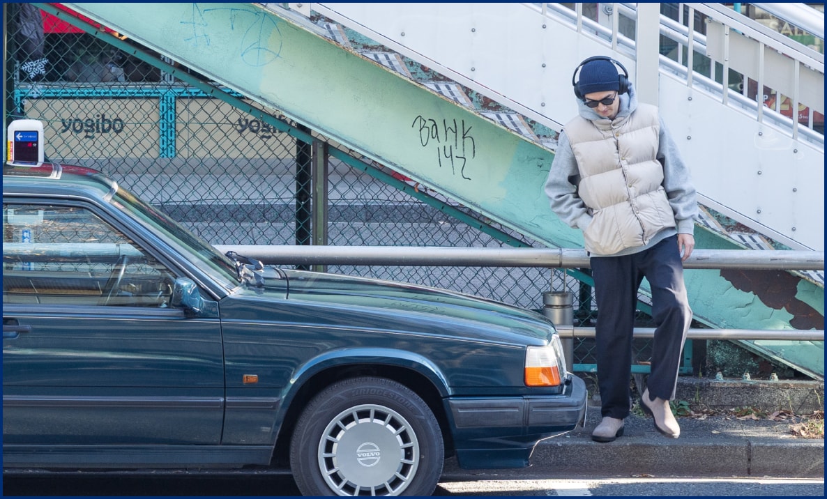 ゆったりとは言いつつ、せっかく渋谷に来るのだからファッションは楽しみたい。ということで、渋谷らしくストリートな雰囲気を意識したコーディネートを。 ボリュームのあるグレーのパーカーに、ダウンベストを重ねて、ネイビーのスラックスとニットキャップを合わせる。足元は全体のバランスを考えてグレースエードのBlundstoneのブーツで色の数は抑えつつ、素材感や小物でストリートな空気感を演出。ダウンベストは着たまま運転もしやすいし、クルマで出かけるときにはちょうどいいのだそう。 クルマがこだわりのある一台だからこそ、ファッションはシンプルなもので組むことを意識しているのだとか。