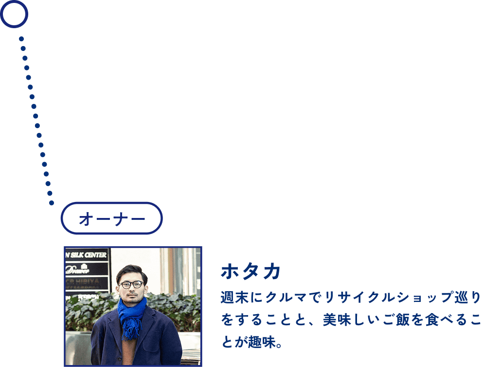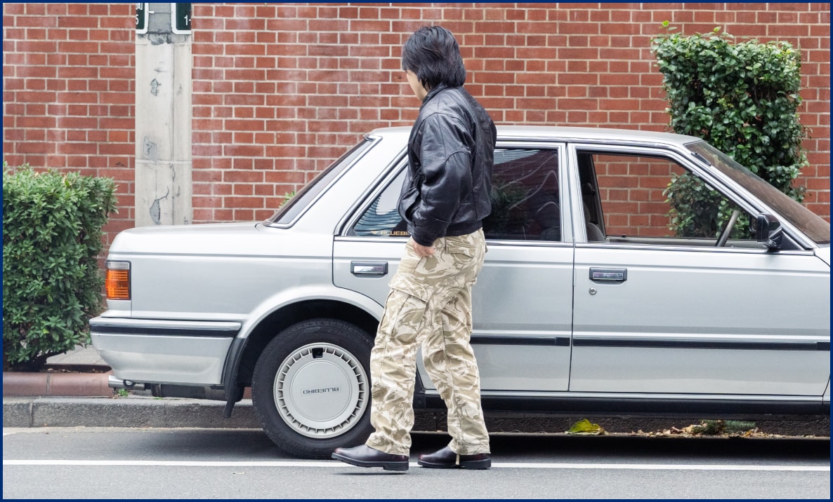 アパレルブランドを運営しているゴウさん。スタイルにこだわりがあるのは言わずもがなで、この日はブラックレザーのジャケットに、イギリス軍のデザートカモパターンのカーゴパンツを合わせる。歴史的にミリタリーファッションのお店も多いアメ横にピッタリ。足元はブラッシュドレザーの表情が個性的なBlundstoneのブーツを。ラギッドなスタイルが80年代の国産車の個性と、独特な空気感の上野の街とバランスが取れているように見える。